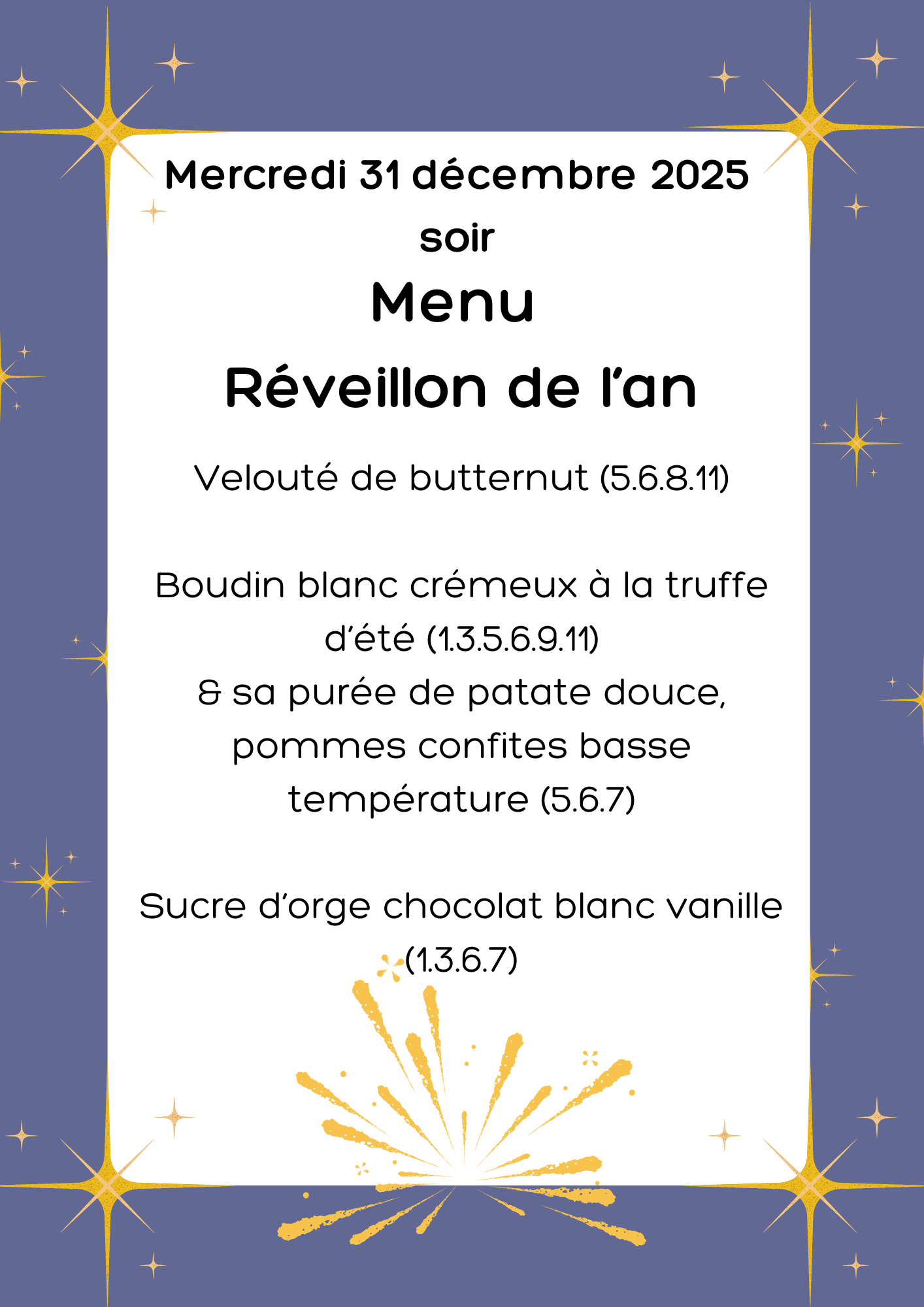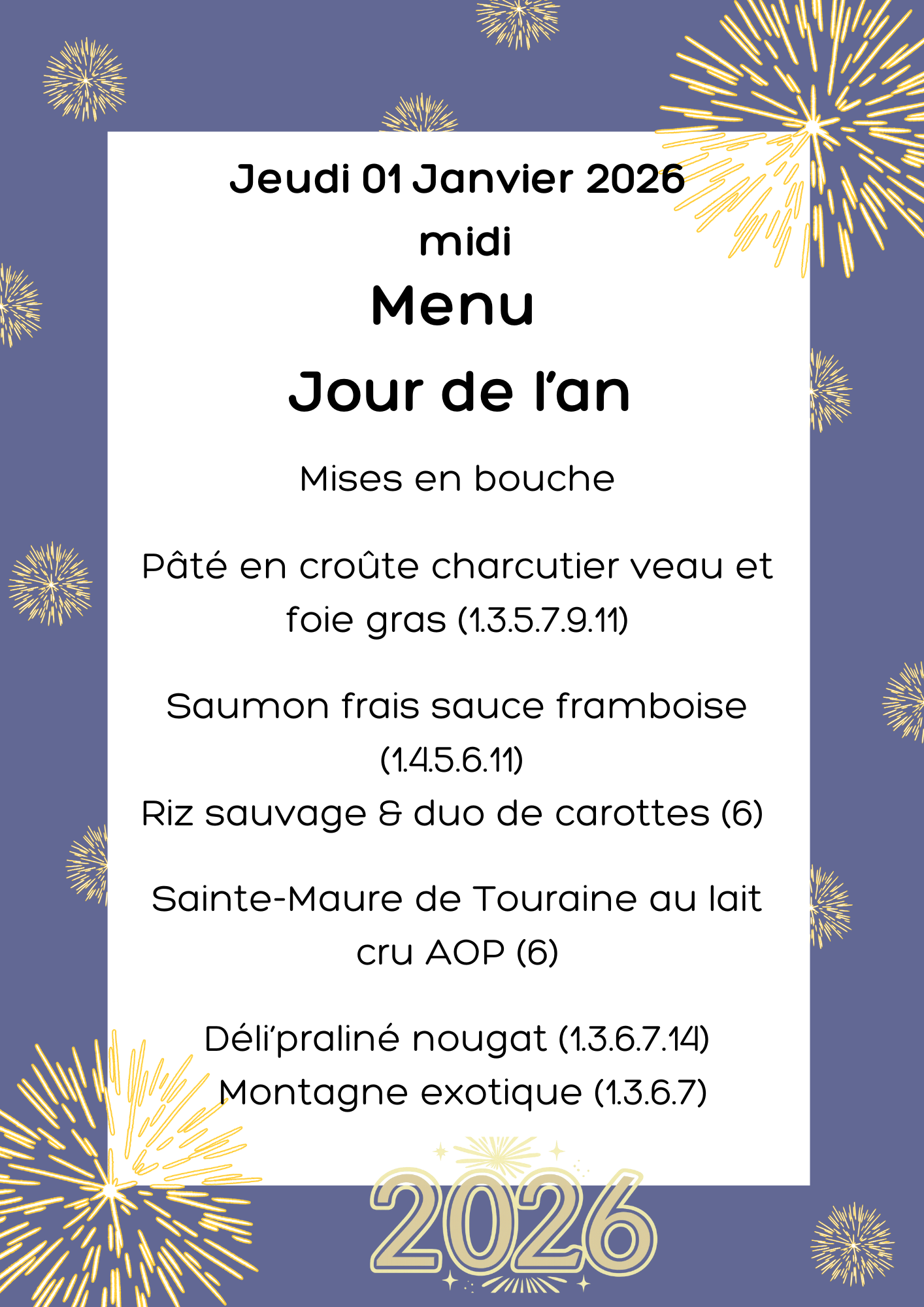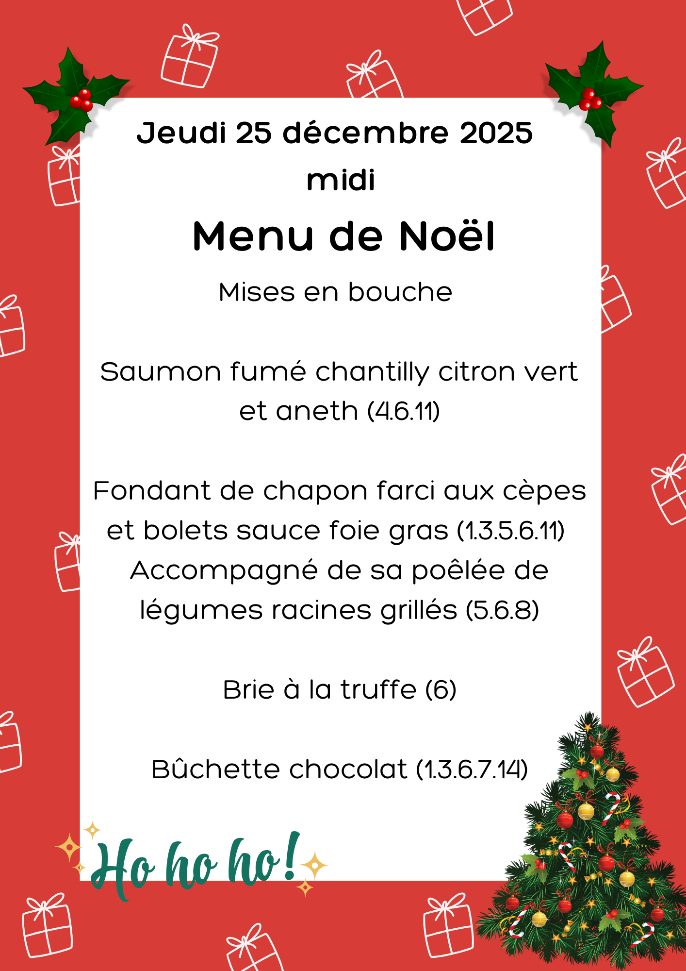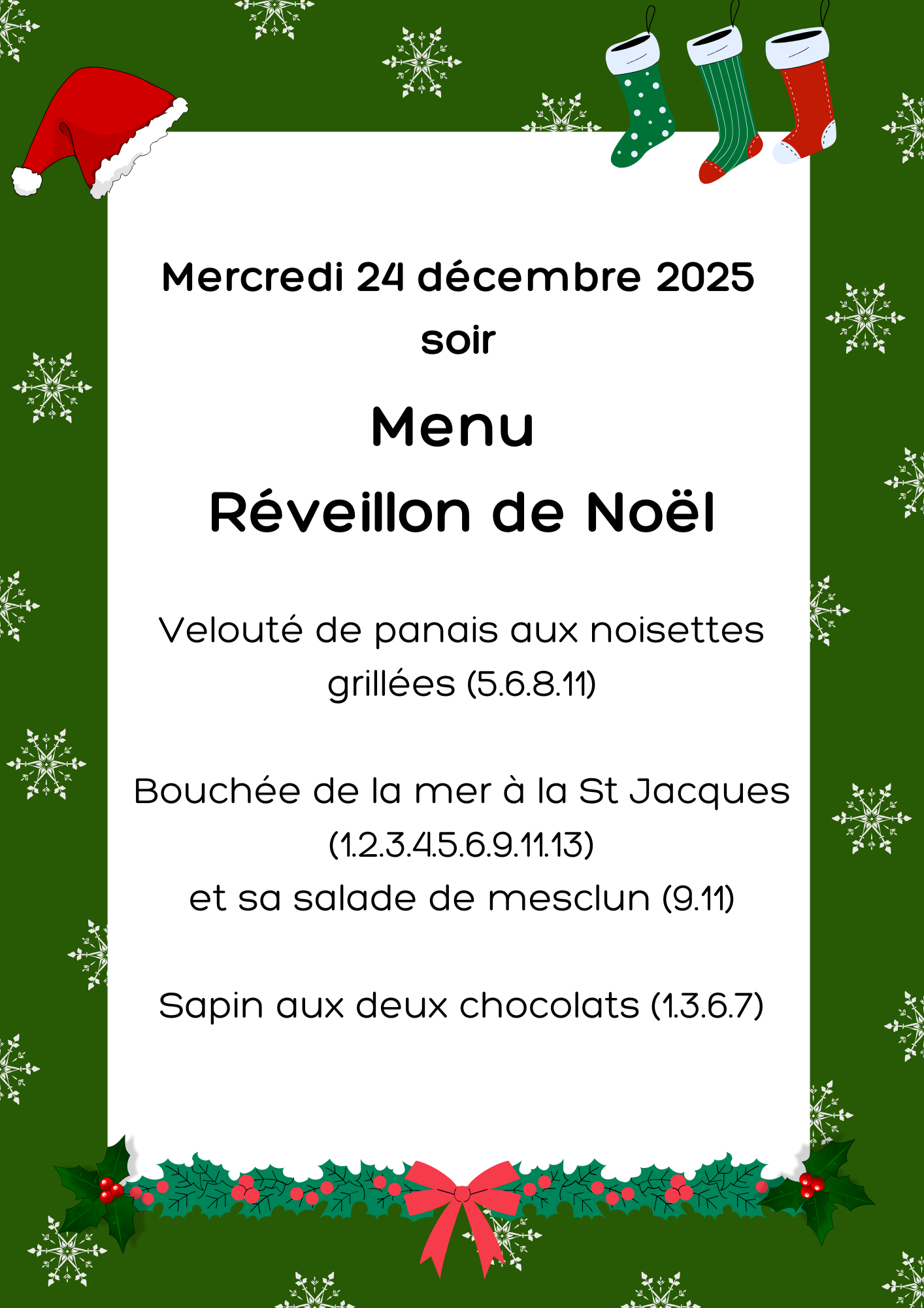 Menus festifs (24 –25– 31 décembre 2025 et le 1er janvier 2026)
